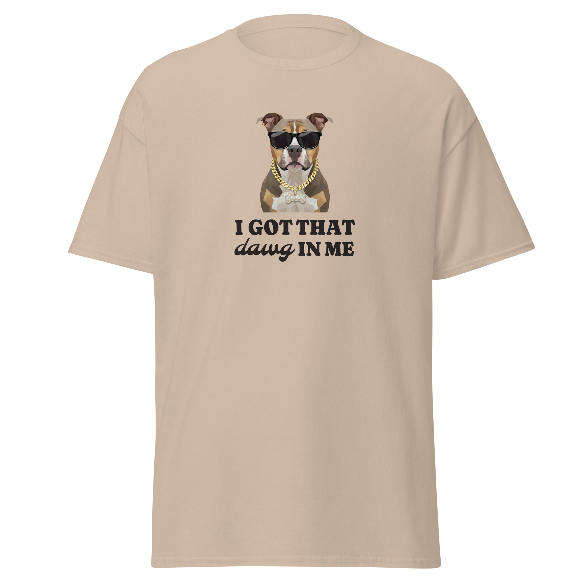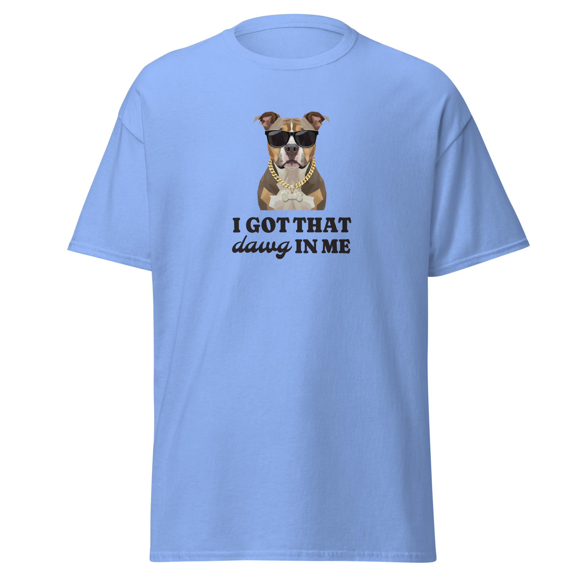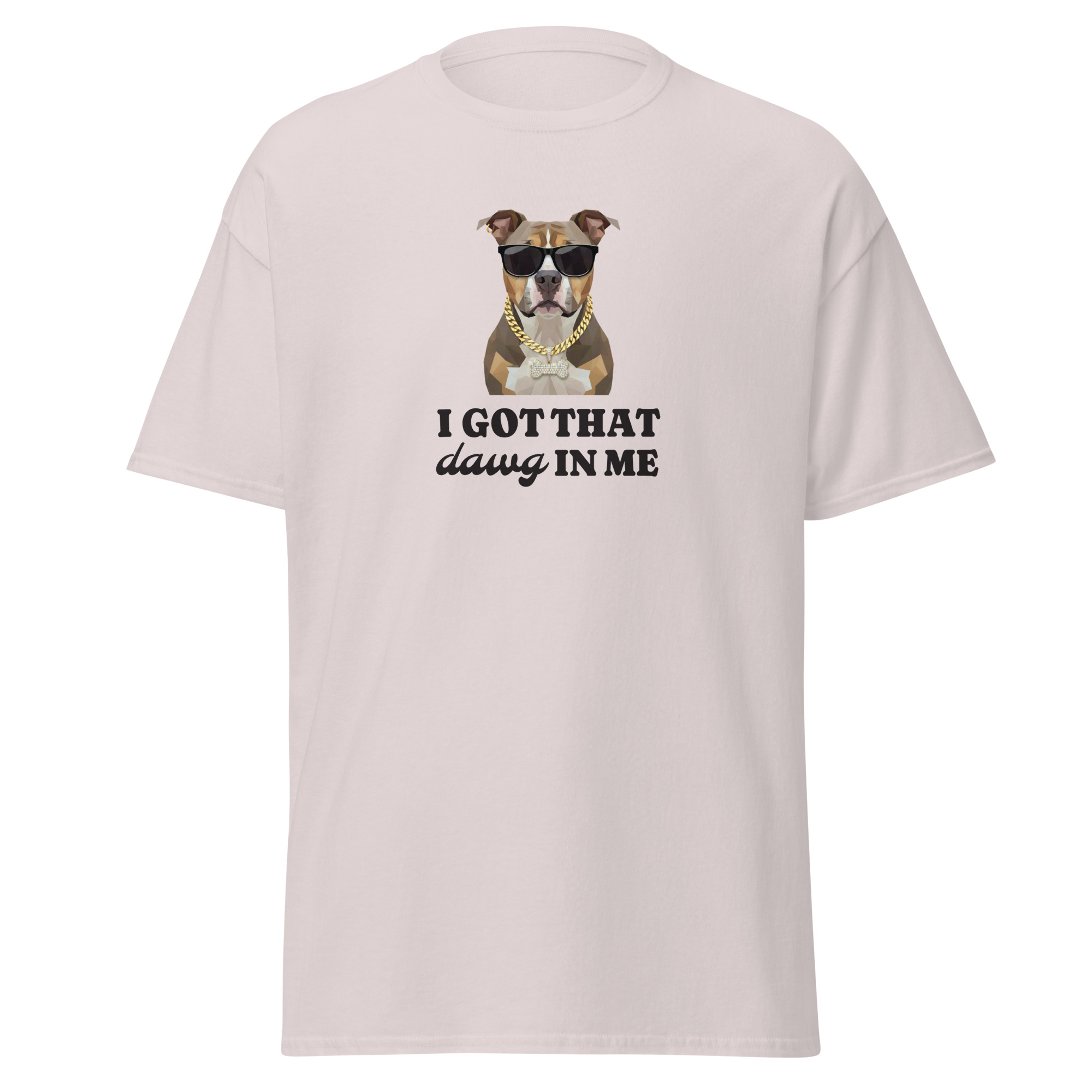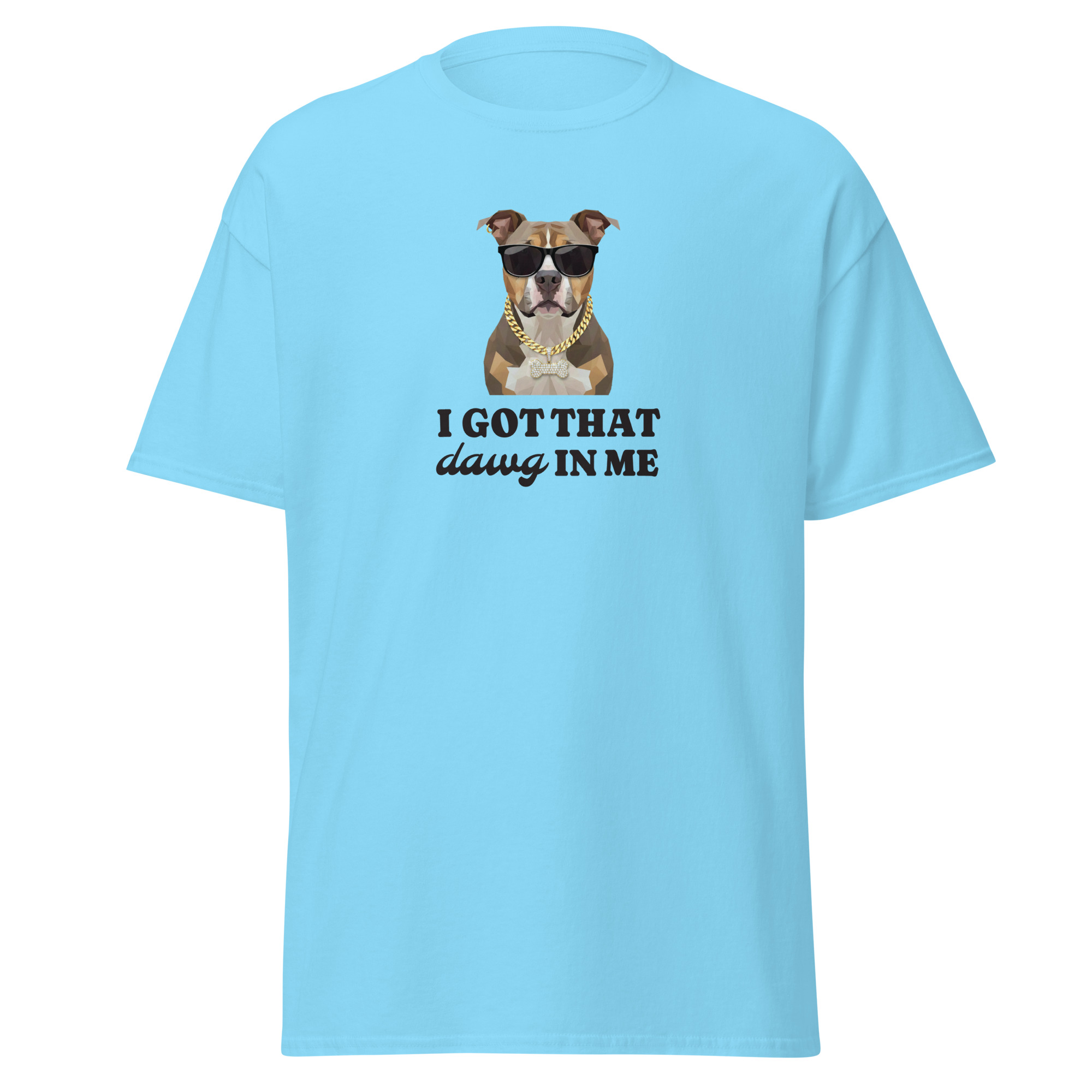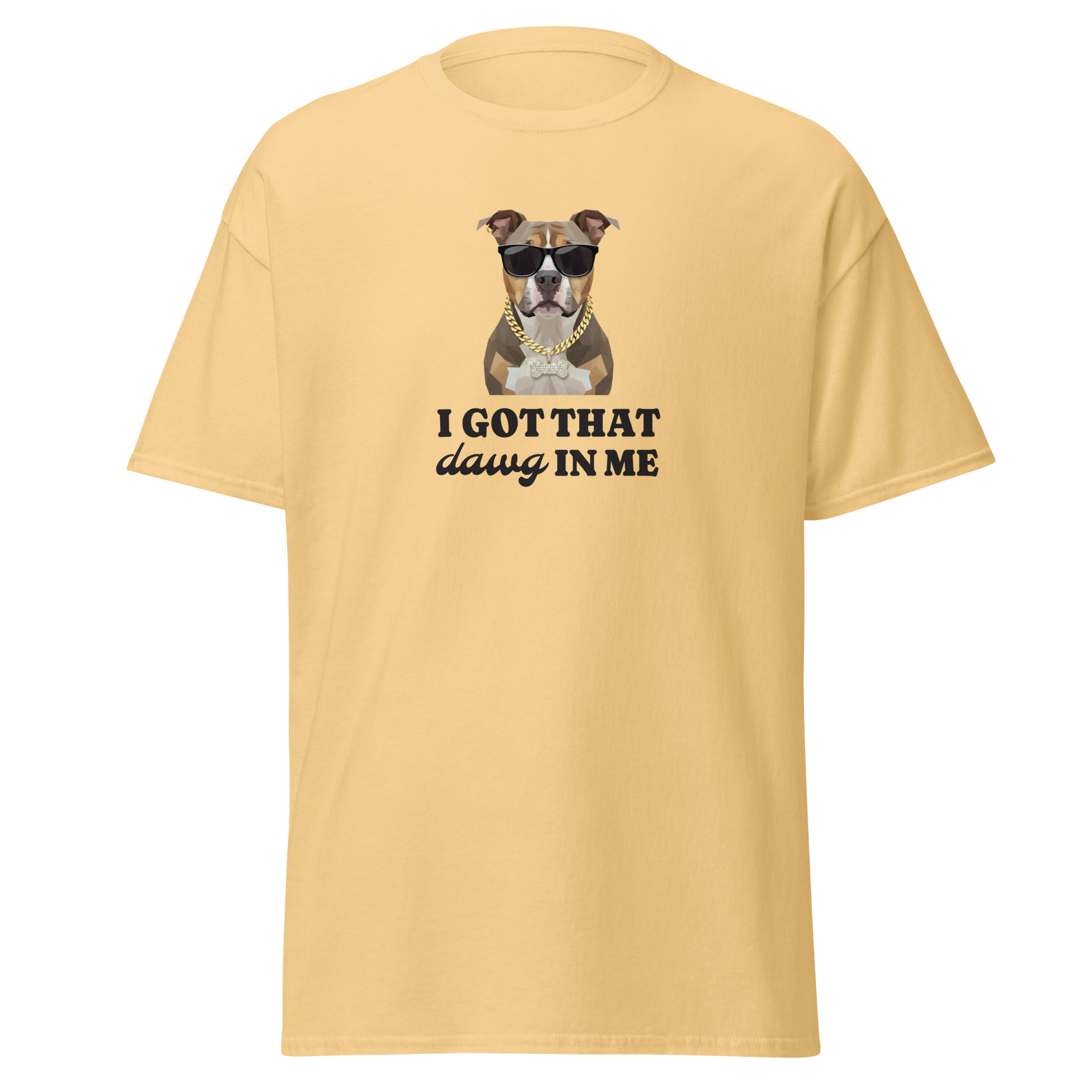 The 100% cotton unisex classic tee reads “I Got That Dawg In Me” for a comedic spark wherever you go. The t-shirt features a handsome pitbull illustration wearing glasses and a gold chain for an extra kick. The shirt sits nice and comfortably, maintaining sharp lines around the edges. This shirt matches perfectly with layered streetwear outfits.