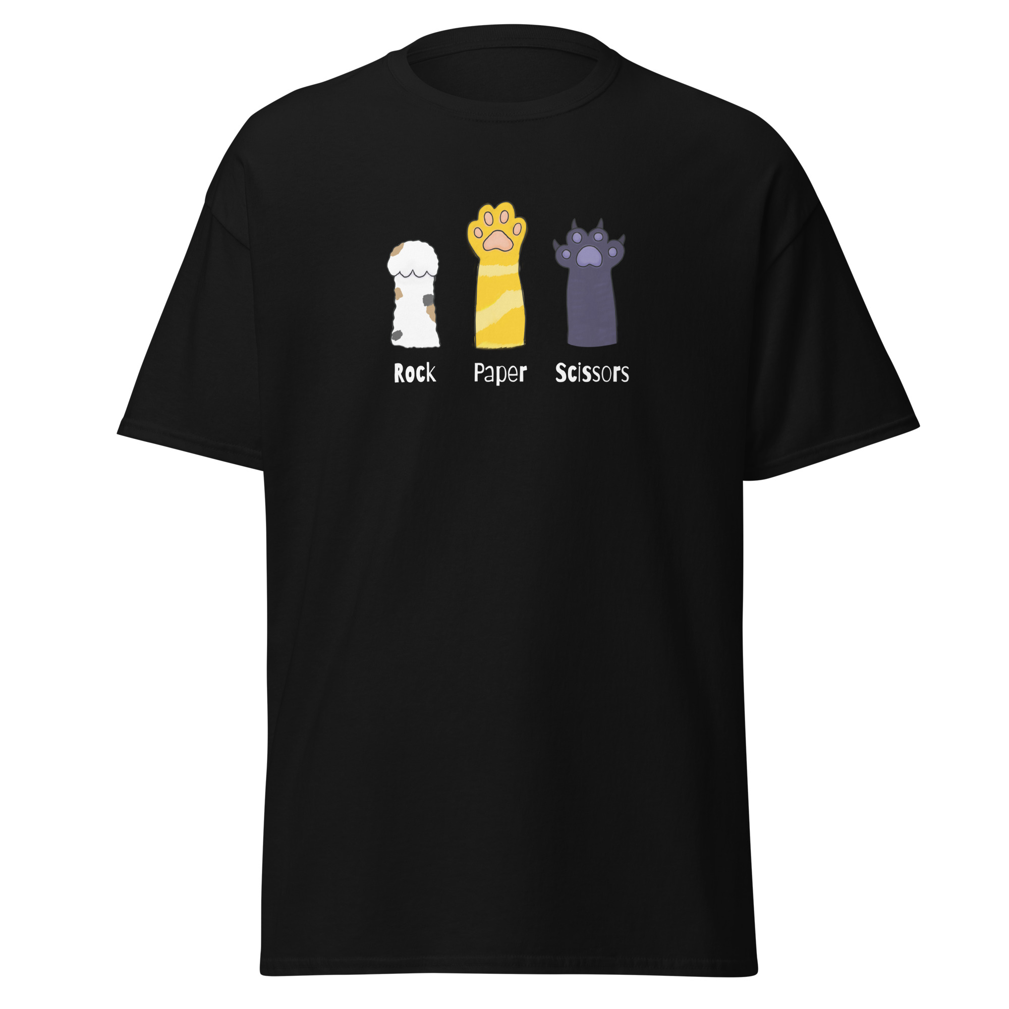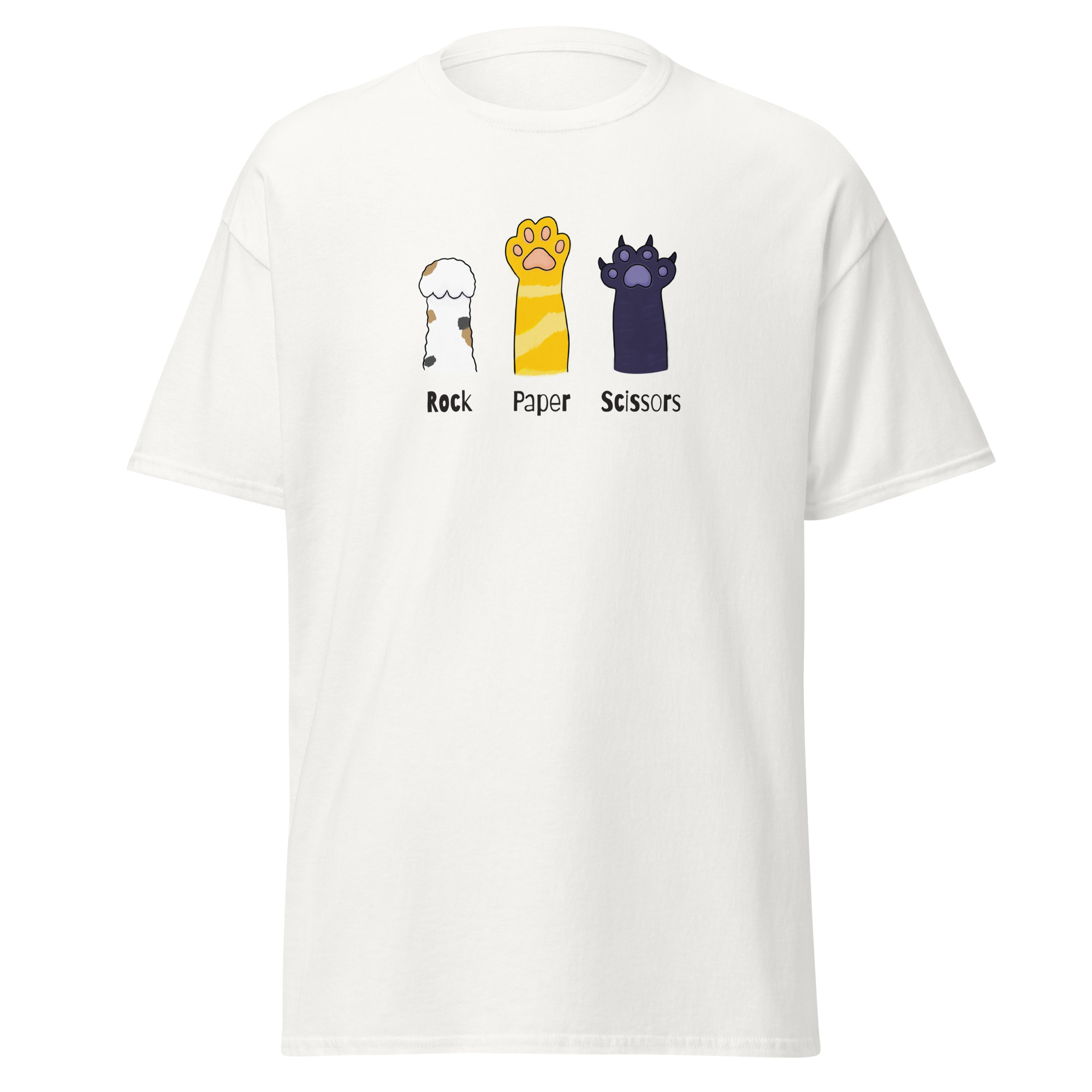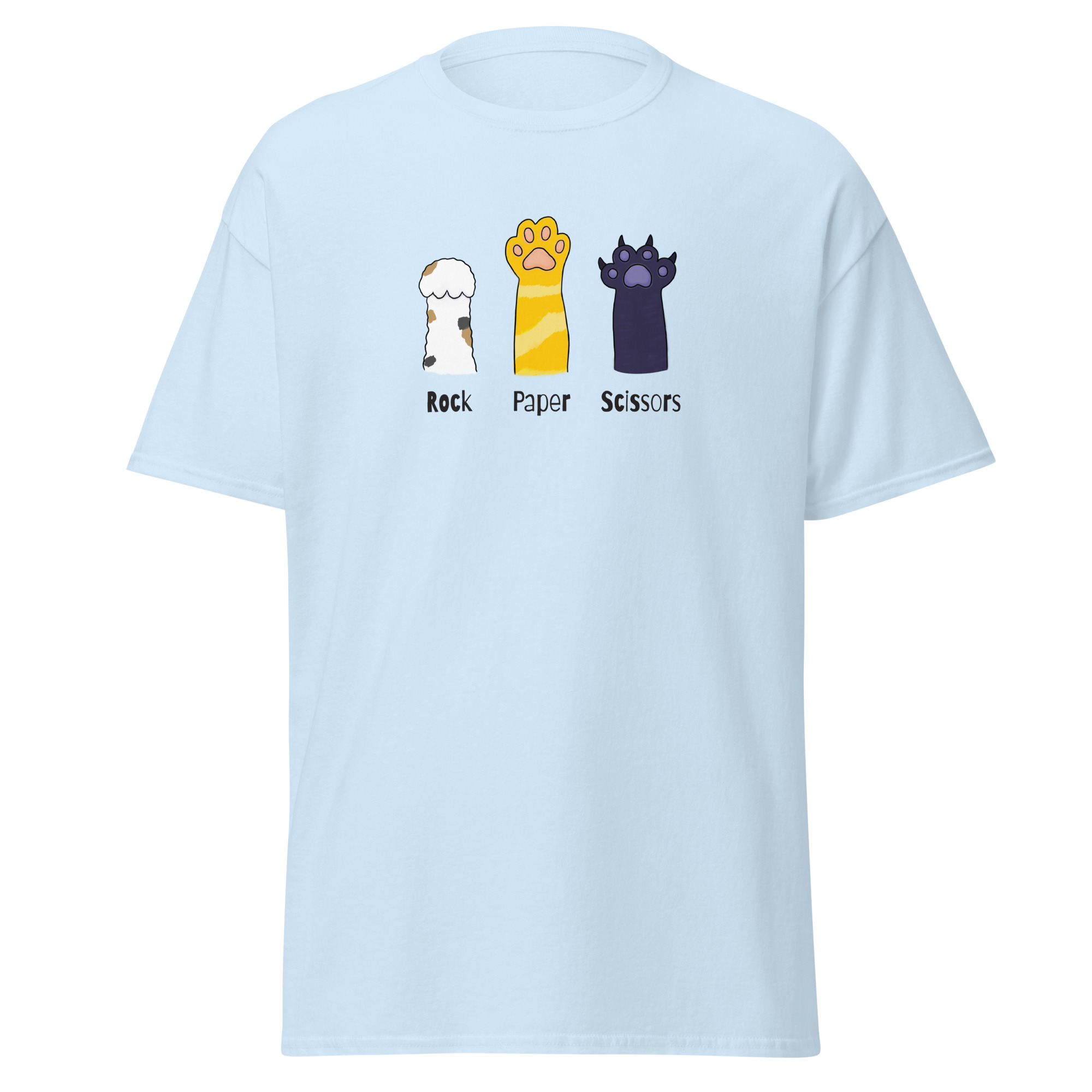 The 100% cotton unisex classic tee will help you find your cat-loving friends. The front of the t-shirt features 3 cat paws extended up toward the sky. One paw raises rock. The second paw raises paper. The third paw raises its’ sharp claws declaring itself to be scissors. If you’ve ever played rock, paper, scissors and been viciously scratched by a cat then you inherently understand. The shirt sits nicely, maintains sharp lines around the edges, and goes perfectly with layered streetwear outfits.