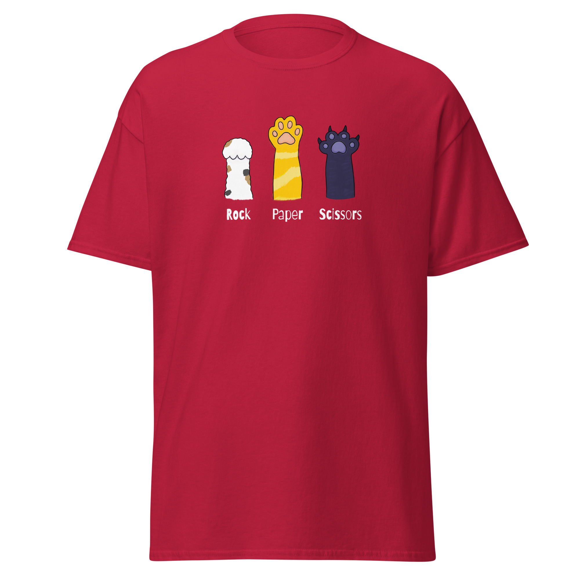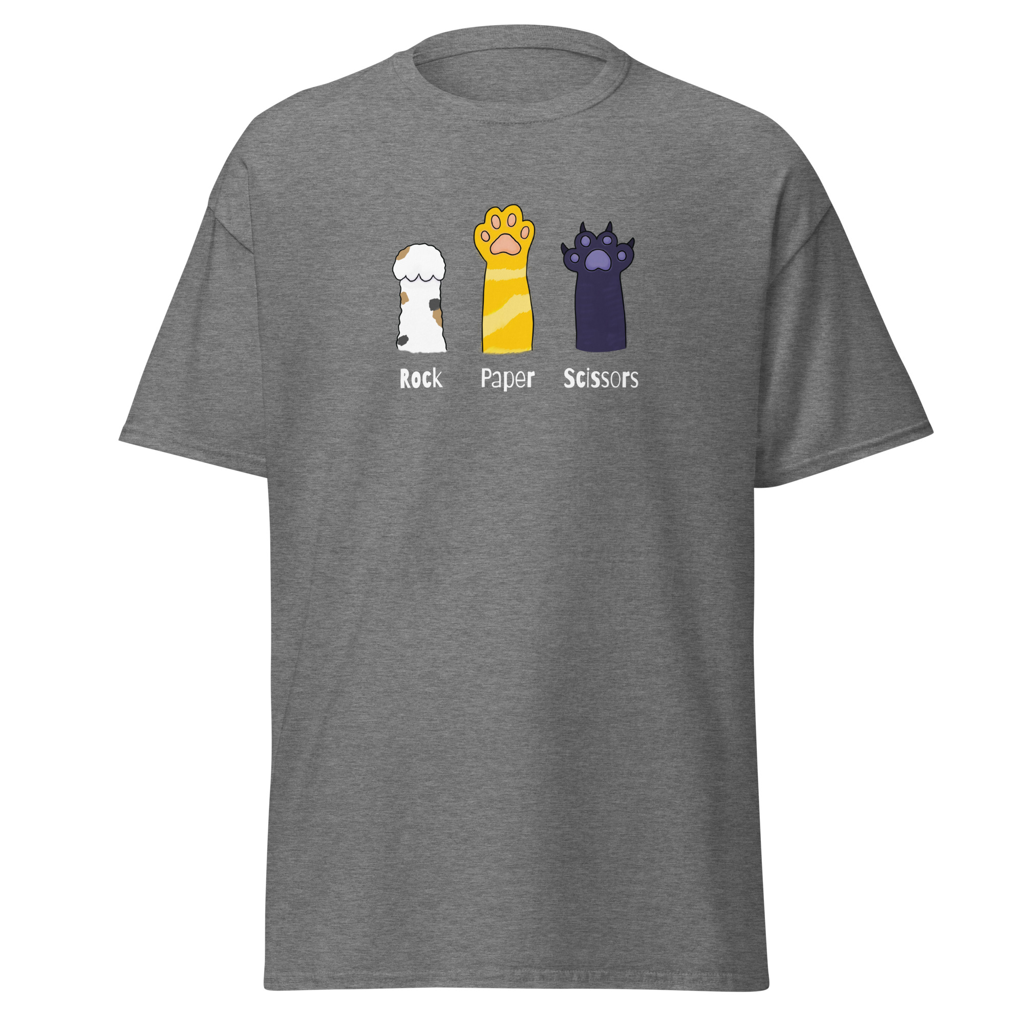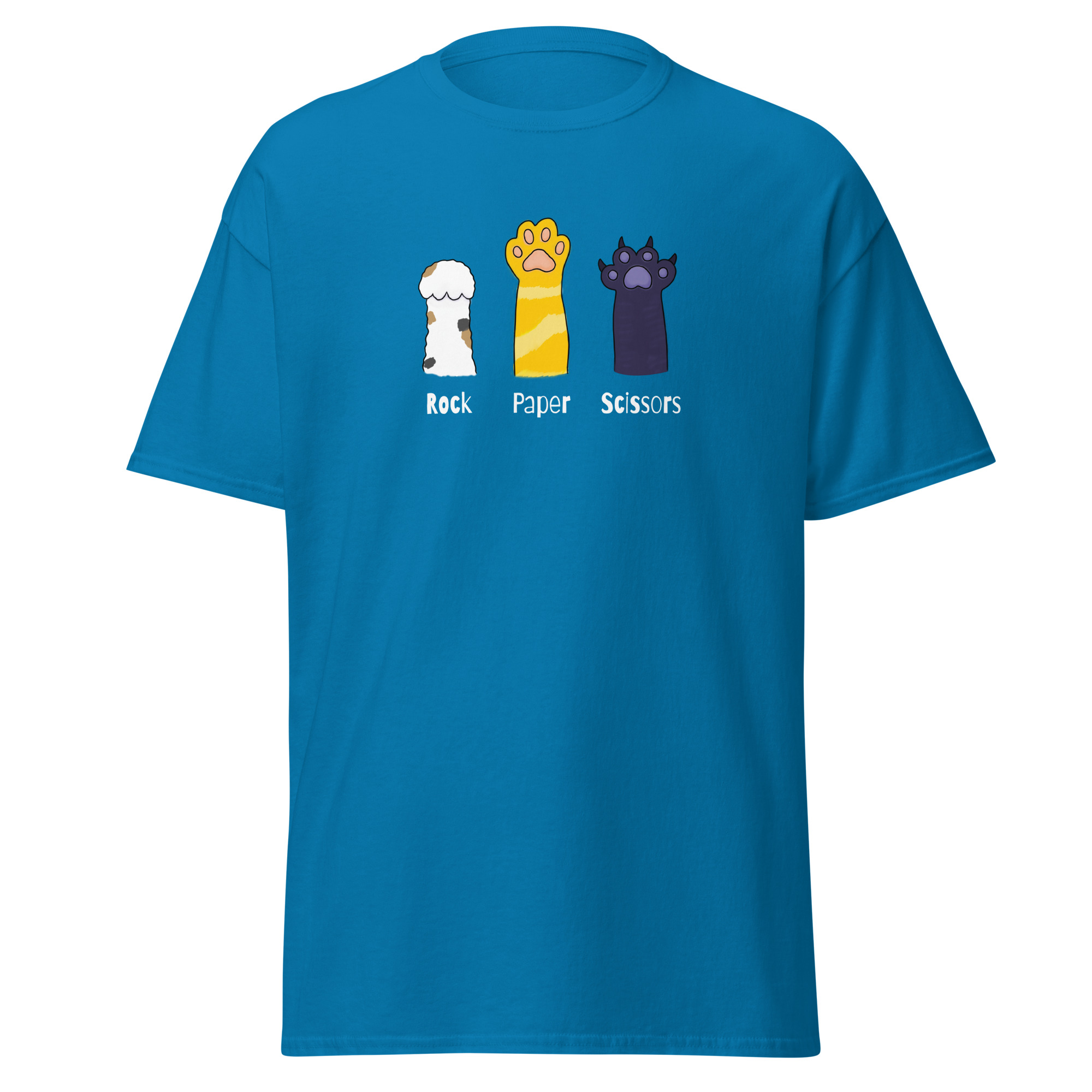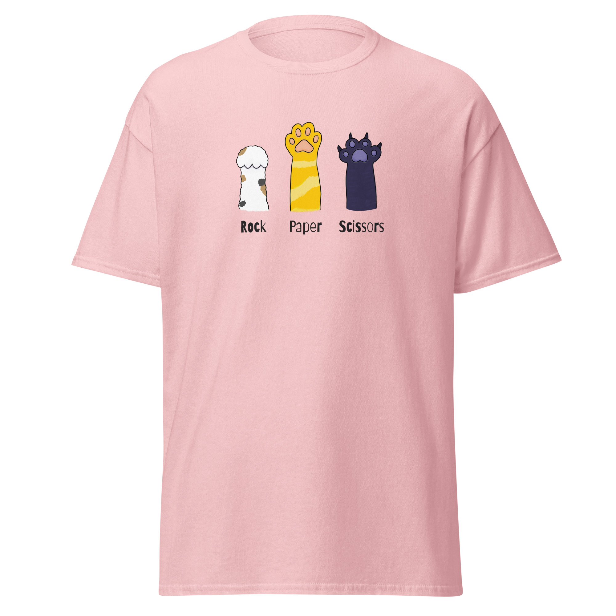 The 100% cotton unisex classic tee will help you find your cat-loving friends. The front of the t-shirt features 3 cat paws extended up toward the sky. One paw raises rock. The second paw raises paper. The third paw raises its’ sharp claws declaring itself to be scissors. If you’ve ever played rock, paper, scissors and been viciously scratched by a cat then you inherently understand. The shirt sits nicely, maintains sharp lines around the edges, and goes perfectly with layered streetwear outfits.